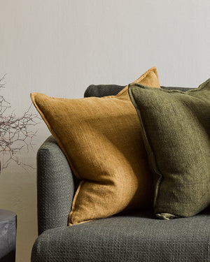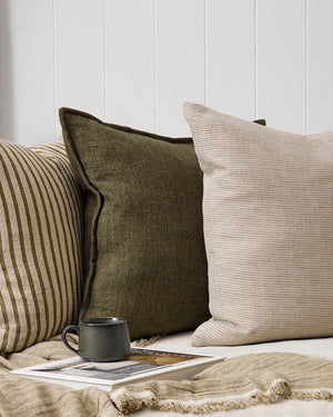 Inspired by the woven texture of Japanese Tatami mats, the Akemi cushion features a contemporary design in camel and off-white tones, with a deep green linear detail. Crafted from cotton and linen, the ribbed weave creates a tactile, earthy ambience that invites us to rest and slow down. Material 100% cotton (front) / 100% linen (back), feather ...